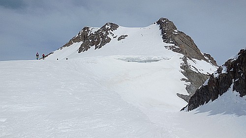 Skúška fyzičky, v diaľke strmý výšvih pred vrcholom Weißkugel