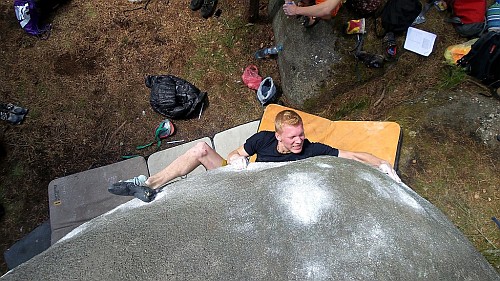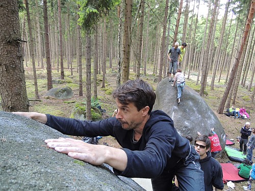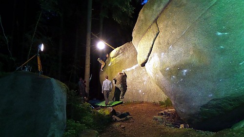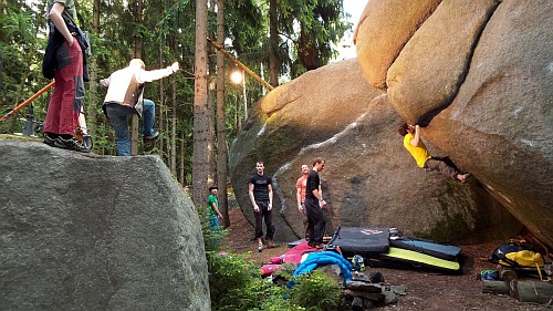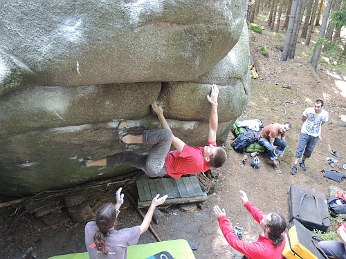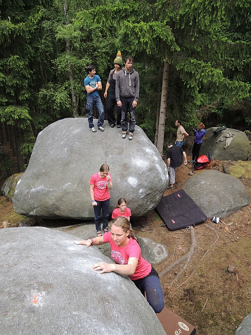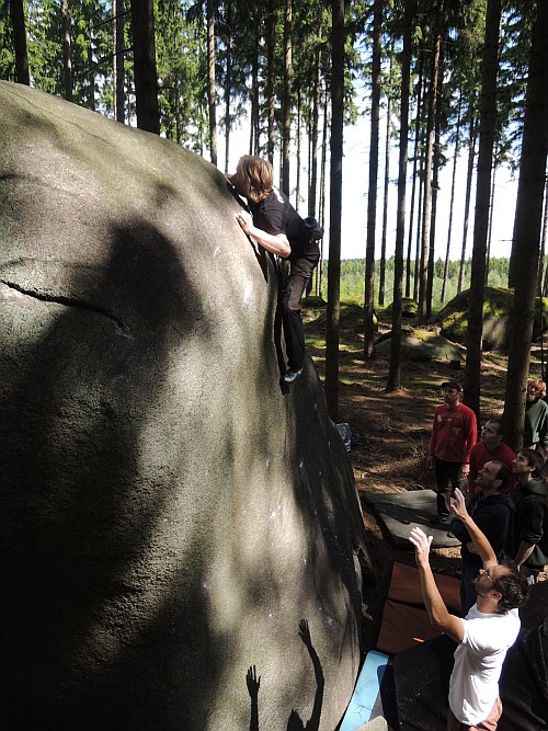 Boulderové osmičky (8A) padly celkem tři v podání čtyřech lezců. Jednu krásnou (viz video níže), s romantickým názvem „Cecky samou loknu měla“ dal pozdější vítěz Honza Novák, druhý v pořadí Oli Vysloužil a stejně tak třetí Jirka Švácha si našli lištovací převis „Mňam mňam SD“, Rosťa Štefánek, který se na akci mihnul, aby mi předal ceny od Lapisu, stihnul mezi pracovními povinnostmi sedavou variantu boulderu Bobo (ostré lišty, jak jinak). Osmičku s lomítkem (7C+/8A) přelezl Rasťo Šulík: „Plné ruce chytů“.