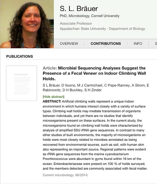 Jinými slovy, s největší pravděpodobností jsou zdrojem fekálního materiálu v tělocvičně nečistoty od lezců, kteří při lezení venku přinesou na lezečkách nečistoty a ty se zachytí na chytech lezeckých stěn.