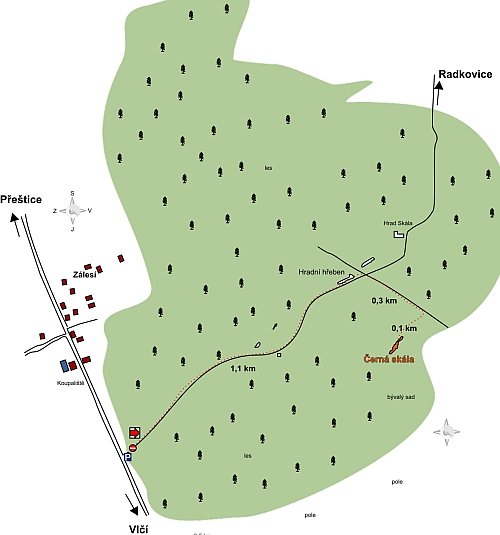 Asi nejlépe je zaparkovat auto asi 500 m za obcí Zálezí na rozšířené odbočce šotolinové lesní cesty. Hned za malým domkem ukrytým na kraji lesa. Pak se vydáte po dlouhé rovné cestě, až se mírně stočí doprava a zavede vás na paseku. Pak procházíte protáhlou pasekou (po pravé straně minete vojenský bunkr) a po levé ruce se objevuje a zase mizí malý skalnatý hřebínek. (Na okraji paseky) Pak začne cesta mírně klesat, a když dojdete na výraznou křižovatku lesních turistických cest (zelená) dejte se nejméně vyšlapanou cestou doprava a asi po 400 m ještě dříve než vyjdete z lesa, se vnořte doprava mezi smrky. Podél vykukujícího neznatelného hřebene. Po několika desítkách metrů (asi tak 100) narazíte na stále se zvětšující hřeben a ten vás dovede až k hlavnímu masivu Černých skal.