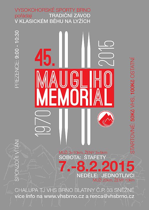 Jménem TJ Vysokohorské sporty Brno jste srdečně zváni na 45. ročník Mauglího memoriálu. Mauglího memoriál je tradiční závod v klasickém běhu na lyžích, který již od roku 1970 pořádají členové Vysokohorských sportů Brno.