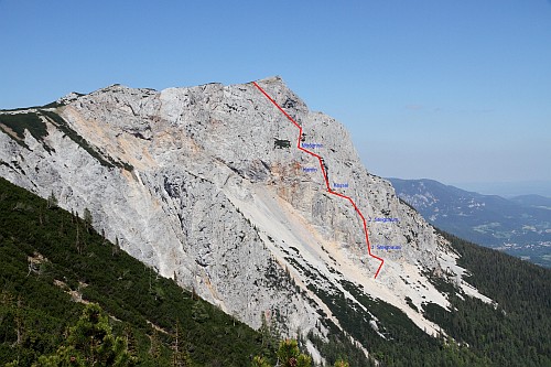 Mám také takový dojem, že mohli traverzovat z Haid Steigu na Konigschusswand steig. Při troše opatrnosti to není moc záludné, ale je tam jedno místo, kdy se musí slézt skalka a visí tam staré fix lano. Každopádně z dálky ten traverz vypadá hrozivě protože pod ním je min 100 m kolmé skály.