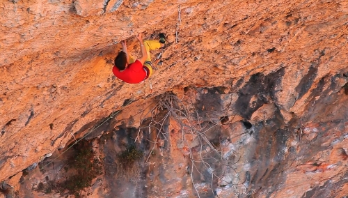 Španělský lezec Edu Marin tvrdě dře na cestě Chrise Sharmy.