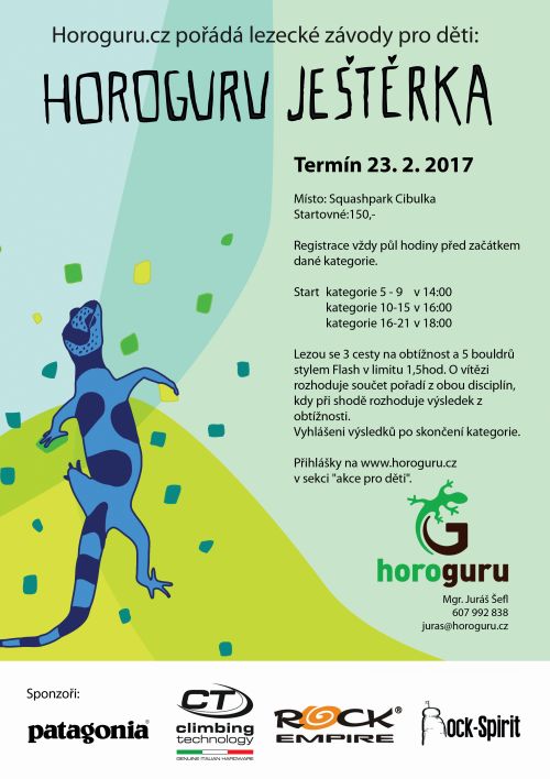 Horolezecká škola HoroGuru pořádá již tradiční dětskou Ještěrku, pojďte při ní změřit síly! Letos opět na lezecké stěně Squashparku Cibulka, kde pro Vás bude připraveno plno nových cest a spousta cen.