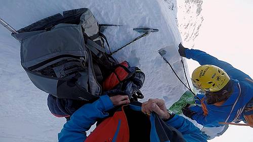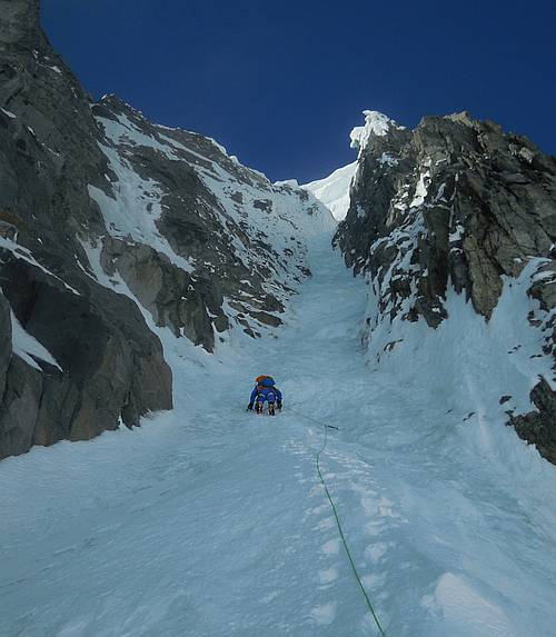 Obtížnost: ED+ (M4/WI5+ a v jednom místě 95°) délka výstupu 850m