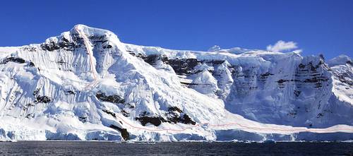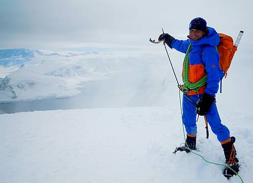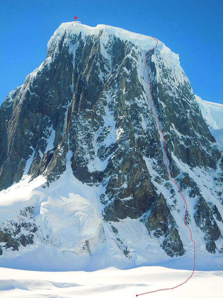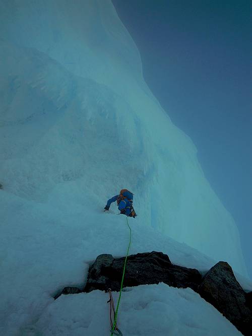 Naštěstí docházíme již pod úpatí bezejmenného kopce. Spíše k takovému sedmisetmetrovému žulovému špalku pokračujícím bílou čepičkou, který je protkán spletí tenkých ledových žlábků. Připodobnil bych to k prožilnění na ruce, kde je minimum podkožního tuku. Jedna z těch žil ukazovala i možnou linii pro výstup. Shrnuto, náš směr začíná přes dolní dojezdový trychtýř, zvrásněný do tvaru plisované sukně a od něj se strmě zvedá úzký ledový pás, který s přibývajícími metry se stále napřimuje. Posledních sto padesát metrů pod vrškem je velký otazník. Kolmý našlehaný sníh a obrovitá sněhová převěj visící nad celou stěnou. Jak tam půjde prolézt, naprosto netuším, ale řídím se heslem, dokud nenastal problém, tak ho nevytvářej. Nějak to musíme z Mírou zvládnout. Začínáme lézt, svah je zatím příznivý, něco kolem padesáti stupňů. Pod malou vrstvou sněhu narážíme na firn, který dobře drží a cepíny i mačky si spokojeně při každém kroku pochroupávají. Z horních pasáží nám neznámý posměváček posílá první pozdrav, když kolem nás s rachotem prosviští vodopád úlomků ledu a šutrů. Tisknu hlavu mezi ramena, přičemž se snažím dělat neviditelného. Jakmile opadl zlověstný hluk, dívám se pod sebe, zda i Míra je v pohodě. Prošlo nám to. Doufám jen, že těchto pozdravů nebude více. Zatím nás trochu chrání stín, ale během hodiny se slunce přetočí do naší jihozápadní stěny. Co se pak bude dít, ví jen antarktický bůžek Škarohýd. Zatím lezeme, přičemž led přitvrzuje na kolmosti a díra pod nohama narůstá. Mám dětinskou radost z pohybu. Dokonce i mé střapečky v botě neprotestují, přestože, před dvěma měsíci doznali díky omrzlinám další, již druhé úpravy. Letní expedice na Gasherbrum v Pakistánu si vybrala holt svou daň. Potvora. Nezbývalo než nabrat pravidelným běháním a lezením zase dostatek svalů, abych se opětovně pohyboval jistě, bez jakéhokoliv váhání. Přispěla tomu i podzimní Sardinie, kde zmíněné aktivy, se odehrávaly pod sálavým sluncem a rány zacelovala mořská sůl. Konečně nezdravá vychrtlost zmizela a teď se opětovně vertikálně hýbu, huráááá. Spousty kroků je přesná mechanická rutina, při zachování tolik potřebné rychlosti. Tím je dán aspoň základ pro úspěch, který stejně ještě není tím zdaleka zaručen. Svah se dramaticky napřimuje, přičemž led je rozdílné kvality. Sem tam cepín zajede jak do másla a podruhé odskočí, či se prořízne našlehanou kaší. Nad hlavou, se už první sluneční paprsky opírají do převěje. Každou chvílí proletí ze shora nějaký ten dáreček. Čas je napěchován napětím a začíná mít nádech ruské rulety. Nechce se mi vůbec vystrčit nos zpoza zákryvu, který vytváří skalní lemování žlabu.