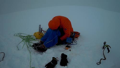 Pokaždé po pár ulezených krocích se snažím za nějaký takový schovat. Jedná se bezpochyby o placebo, jelikož v sedmdesátistupňovém úzkém žlábku, hrát si na schovku, moc nejde. Vzápětí první úspěch zaznamenán. Zásah a potopeno. Míra dostal přímo na ciferník. Naštěstí jen malým ledovým úlomkem, který si našel prostor mezi jeho nosem a okem. Však krve jako z vola. Hrdinství je třeba něco obětovat. Teď skápla první kapka krve a boj dostal nádech dramatu. Jak dál? Dolů zlézat je stejná blbost, jako lézt v této chvíli vzhůru. A zůstat na místě je naplnění stejně jistého finále. Nedá se nic dělat a lezu dál s vědomím čistokrevné loterie, neboli koho má trefit, toho to stejně trefí. Takže je lepší to slíznout za pohybu, než jen pasivně čekat a užírat se vědomím, že to nejspíš stejně přijde. Vím dost blbé, ale když už jsme se sem dohrabali na ono neutěšené místo, tak už je pozdě na dotaz, co asi k čertu s tím najednou máme dělat. Žádná uspokojivá odpověď není. Kostky jsou vrženy, tak je třeba lézt dál a věřit na šťastná čísla, která přeci musí přijít. A přijdou? Další hodiny si odbýváme s různou odstupňovanou hrůzou, která neodchází, ale naopak geometricky přibývá. Průlez pod sněhovou převěj, začíná tlučením do velice špatného ledu s úhlem devadesáti stupňů. Žádné šrouby do ledu v tomhle třicetimetrovém výšvihu nestačím dávat a ani by neměly kdovíjaký přínos. Led je takový provzdušněný, že pevnostně by stejně nic neudržel. Jen trnu, kdy cepíny i mačky ustřelí. Následovalo by zřícení dolů k Mírovi, kterého vezmu i s tím málem jištění, co máme mezi sebou, pěkně trádá do údolí. V duchu si hraji s myšlenkou, že by pád byl vlastně vysvobození z napětí. Místo toho, pořád přemlouvám lýtko na pravé noze, ať nezačne strachy vibrovat. Ruce omdlévají z odkrvení, vlastně jen pohled potvrzuje, že je mám. Nádech hysterie zahání racionální část, poděláš to a jsme mrtvý. Pád je konec obou. Zasekávám posledních pár úderů do pokládající části ledopádu, již za zvukového doprovodu, kdy hekám podoben rodičce těsně před příchodem nemluvňátka. Mám toho dost. To ale není zdaleka konec. Poslední dvě délky lana, neboli přibližně posledních sto metrů je nejvýživnějším ekvilibristickým kouskem. Travers nad zející dírou, v nedržícím sněhu s drobící se skálou. Hotový průser. Zakončení je přes převěj v cukrové vatě s úhlem víc jak devadesát pět stupňů. Jinak řečeno nebeský převis, s lezením po načechraném vzduchu. Po traverzu dobírám Mirka a sunu se dál do tohoto posledního úseku. Každá sekunda se vleče a je nekonečná jak celý vesmír. Zasekávám hroty cepínů, které se při zatížení dost neochotně zastavují v sypkém sněhu, i když nechápu, proč vlastně drží. Udolávám centimetr po centimetru, stále blíž k obzorové hraně. Nohy občas vyletí, přičemž začnou plandat nad zející dírou. Čekám v každém kroku pád a v té hrůze řvu za mizejícím lanem vlnící se někam k Mírovi, ať dává bacha. Bylo to jen takové zoufalé odplivnutí a jeho uklidňující odpověď, jsem vlastně ani nevnímal. Snažím se stabilizovat nervy, které mají tendenci vystřelit z těla, jak přetržená struna. A minuty dál plynou a mění se ve věčnost. Teď už rozhodně nechci spadnout, to by byla škoda, takový kousek před vysvobozením. Přesto jsem tomu stejně blízko a zároveň tak daleko. Nakonec se mi daří vykopnout „nebeskou patu“ přes hranu, přičemž ji uchvátím silou kobry a navalím se do zemně svobody. Jóóó a jóóó kurva, je to tam! Z plic se hrne veškeré uvolněné napětí. Za další půl hodinu dolézá Míra. Je po druhé ranní a slunce už je zase na jihu. Tak by řekl klasik. Neboli žhavý kotouč se dotýká obzoru, přes který se v tomto období nepřekulí. Jedná se o kouzelný úkaz, kdy se rozlijí po obloze barvy od nachové, po purpurovou a další škálu odstínů. To trvá vše až do chvíle, kdy se znovu slunce odrazí, již rozzářeno k denní pouti po nebi. Dolézáme na panenský vrchol ve výšce tisíc metrů nad hladinou, který dostává pracovní název Monte Pižďuch.