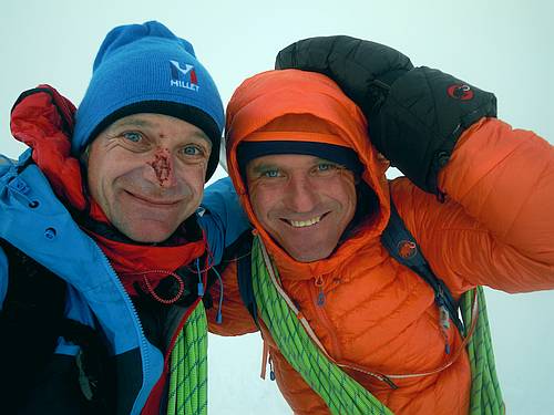 Cesta: je pojmenována „Bloody Nose“ Byla vylezena alpsky, přičemž jsme přešli při hledání sestupu celý hřeben čtyř vrcholů a vrátili se po 33hodinách v čase od 6.1 až 7.1 2018
