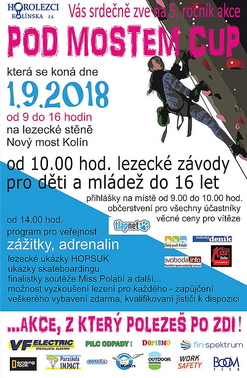 Uskuteční se na Kolínsku na lezecké stěně Nový most Kolín. Akce je určena dětem a mládeži od předškolního věku do 16 let a připraven je i doprovodný kulturní program pro veřejnost. Akce začíná v 9 hodin.