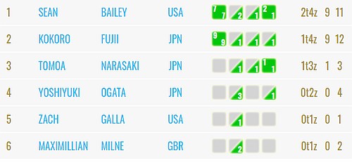 Druzí byli Japonec Kokoro Fujii a na předminulém závodě dominující Slovinka Janja Garnbret. Třetí skončili favorizovaný olympionik Japonec Tomoa Narasaki a Američanka Brooke Raboutou.