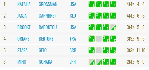 O vítězství v ženách rozhodovaly počty pokusů. Natalia Grossman dala 4 topy na první pokus, Janja Garnbret měla také 4 topy, ale na 6 pokusů.