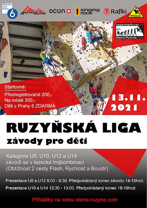 V sobotu 13.11. se uskuteční v Praze na Ruzyni závod pro děti. Závod se koná pod ČHS – 3.liga. Závodí se v trojkombinaci (2 cesty na obtížnost a 1 cesta na rychlost a 5 bouldrů). Kategorie U8, U10, U12 a U14. Ročníky dětí: 2008 až 2016.