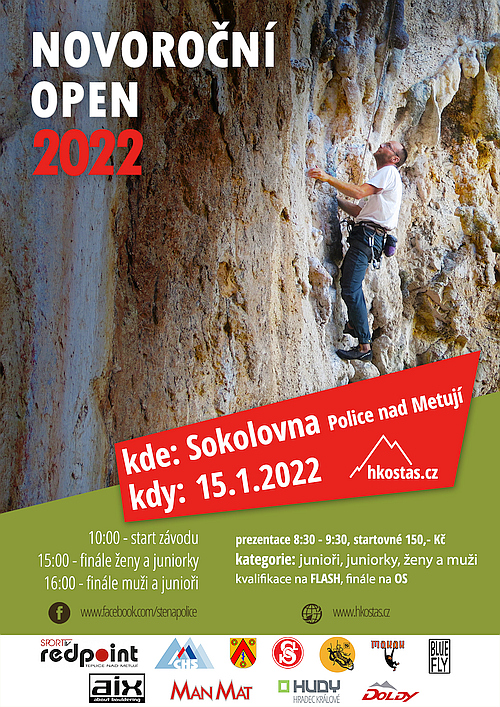Horolezecký klub Ostaš Vás srdečně zve na závody v lezení na obtížnost Novoroční OPEN. Letos 30. ročník tradičního otvíráku sezóny proběhne v sobotu 15.1.2022 na stěně HK Ostaš v Polici nad Metují. Závod je vypsán pro muže, ženy, juniory a juniorky, ale je open směrem dolů. Takže pokud jste kategorie A, B, případně U14 můžete si to rozdat s juniory.