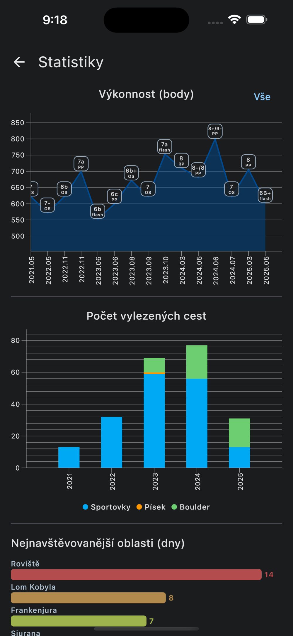 Základní přehledy a vizualizace, které ukážou, jak se vyvíjí tvoje lezení v čase.