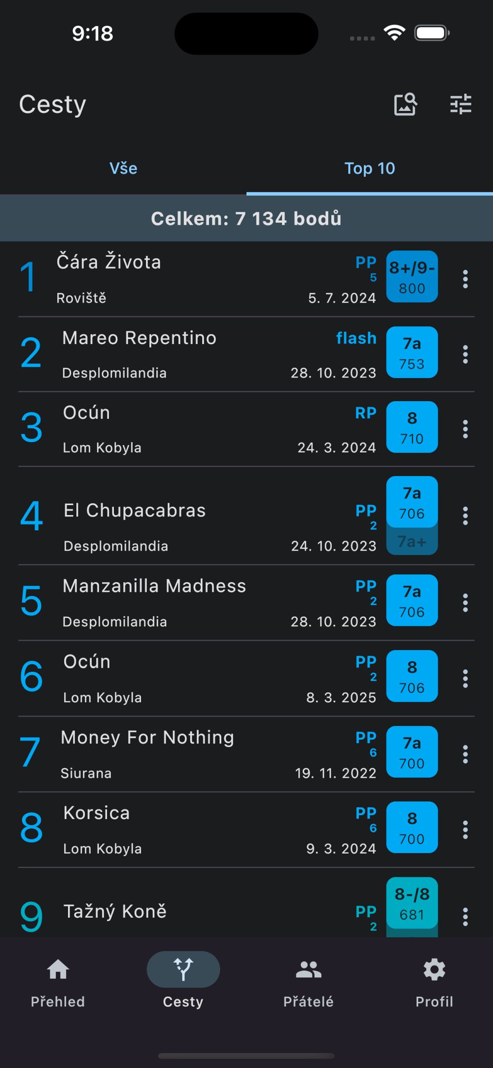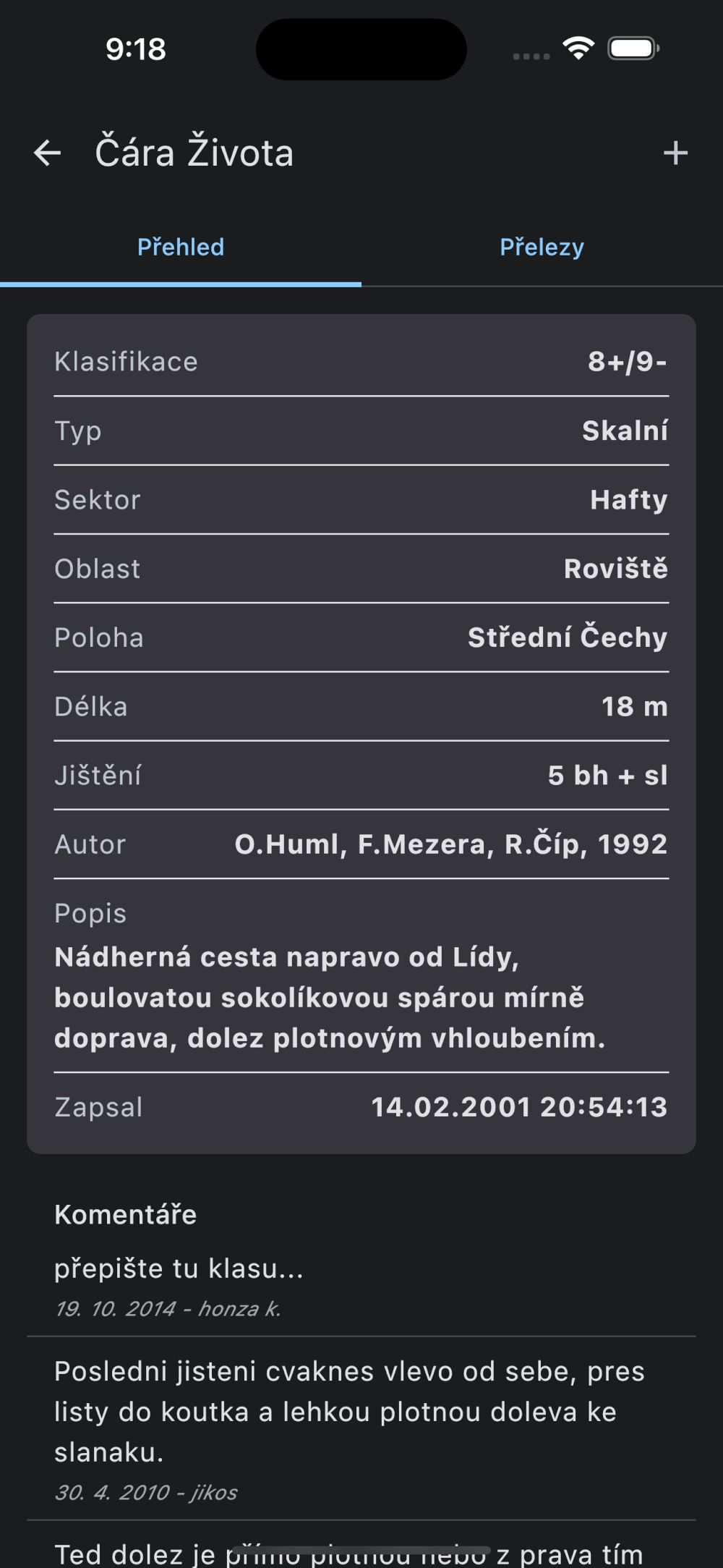 Přehled všech tvých přelezů s možností se kdykoli vrátit k podrobnostem.