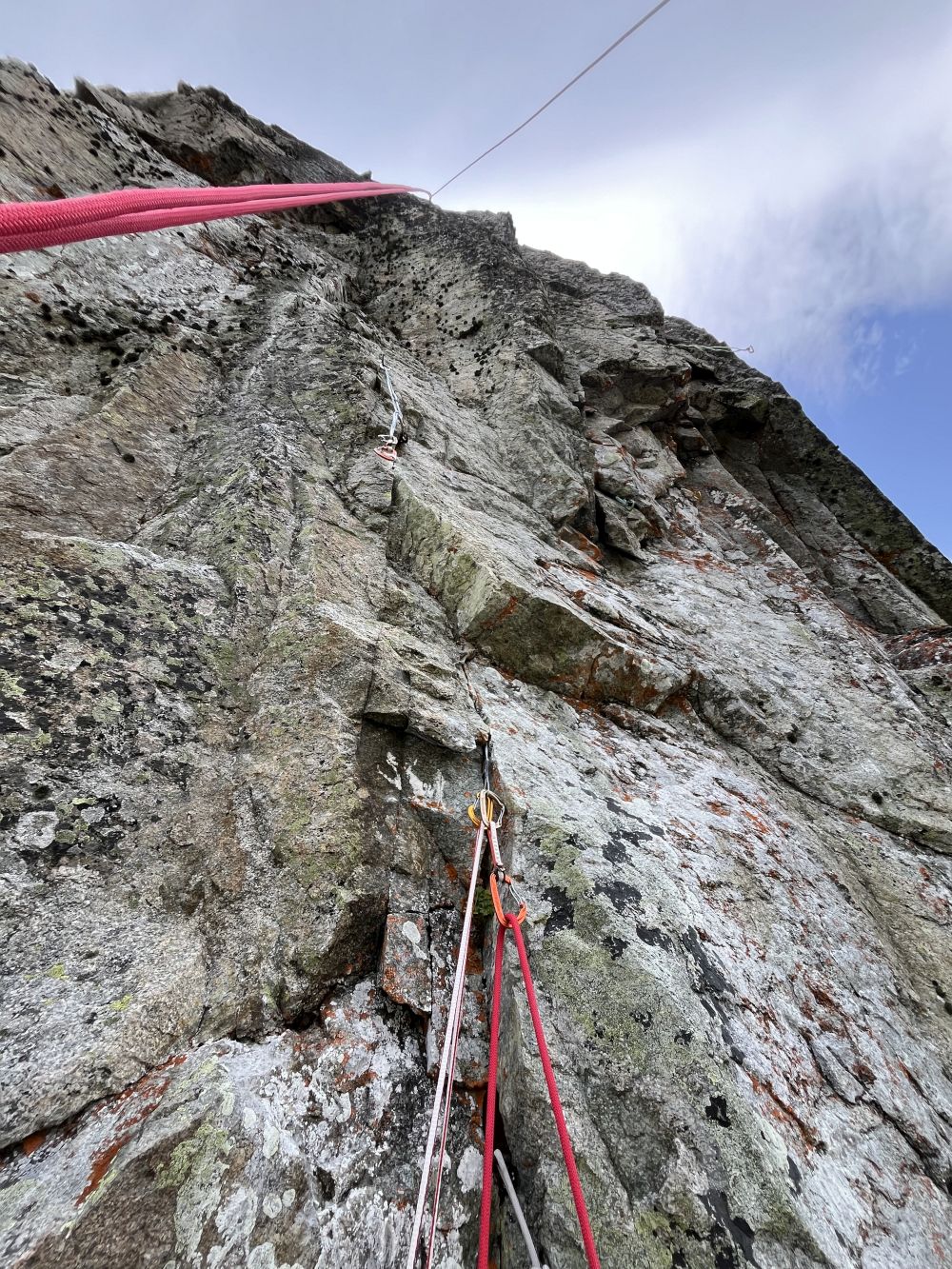 Další délky docela šly, resp. lépe, než jsem čekal. Na druhou stranu podmínky byly zase horší, než jsem čekal. Mělo foukat 6-22 m/s, což je samozřejmě dost, ale od JZ. Buzolu jsem neměl, abych ověřil, zda jsem opravdu v severní stěně. No nic. Šel jsem stejně do cesty spíše otestovat, zda by šla sólo volně a zda bivak je v pohodě.