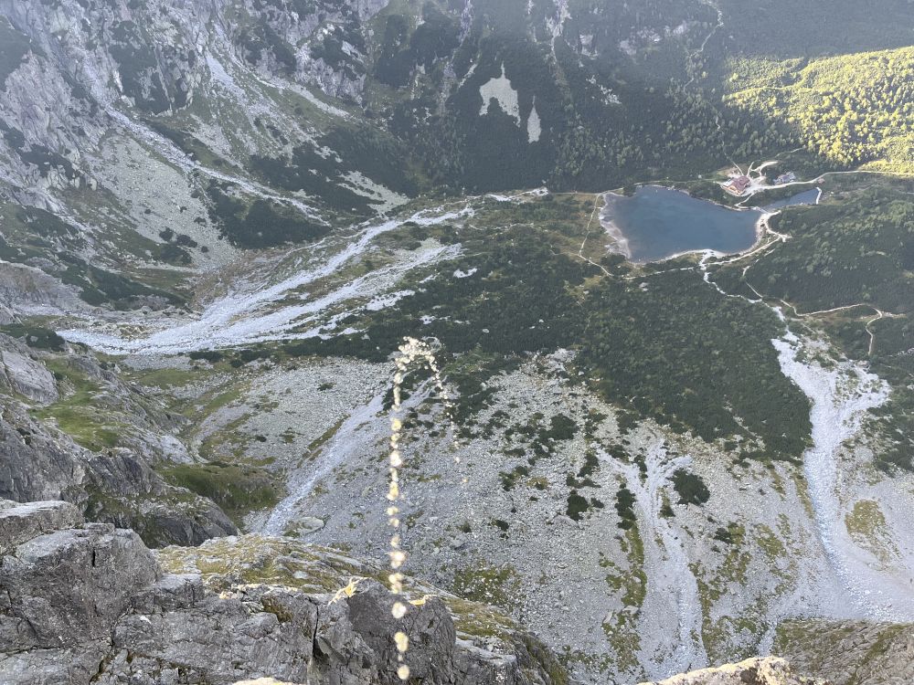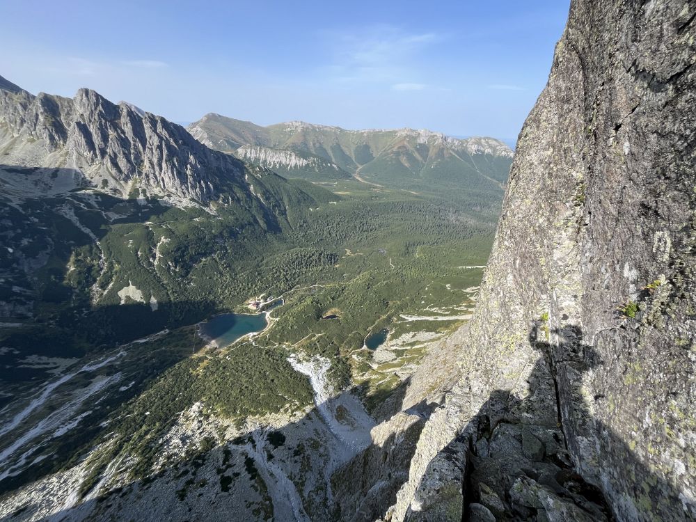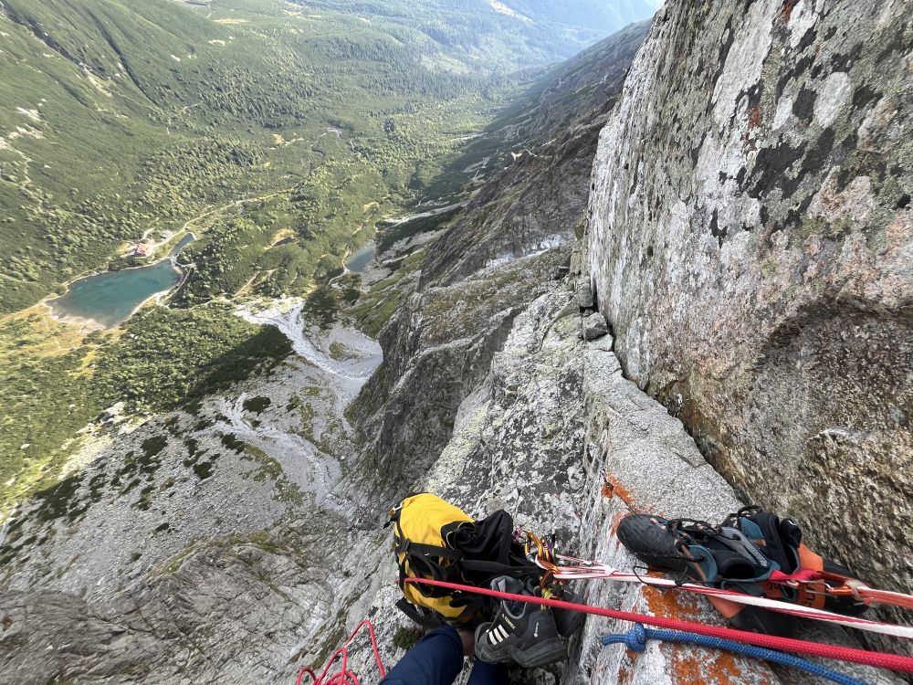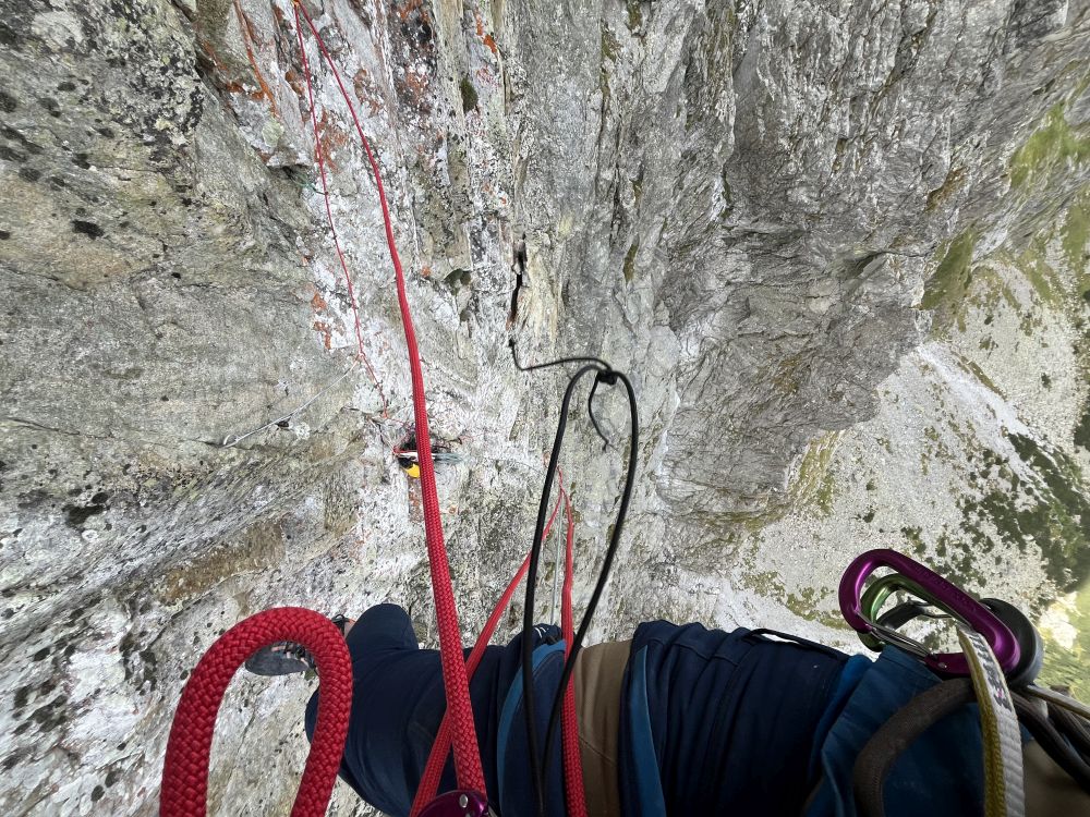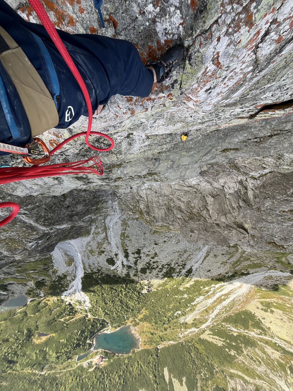 Střih. 28. 8. ráno nastupuju do Superdiretissimy sám, tedy úplně sám nejsem. Je se mnou svině a pěkně těžká – 4 litry vody, 2 lana (singl a půlka), friendy, vklíněnce, expresky, karabiny, blokanty, teplé oblečení, spacák, karimatka, vaření a jídlo. Cesta je na tatranské poměry dlouhá, má 13 délek plus dolez na vrchol Pavúkove veže. Při jištěném sólu je navíc potřeba každou délku vylézt, zafixovat lano na štandu, při slaňování vybírat některé jištění a některé nechat a refixovat na nich loďákem lano, aby při následném žumarování se neprodřel oplet, resp. refixování je nutné také pro diagonální a traverzové délky. Po slanění na původní štand se zruší a žumaruje s tahačákem zpátky nahoru.