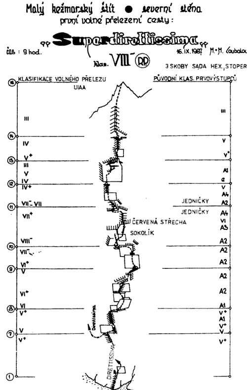 PS: Klasifikace se diskutovala na webu. V původním topu volného přelezu Coubalovců je 8(-?). Pak se něco ulámalo. Miro Peťo udělal první přelez a „díky“ komentářům na webu navrhnul opatrné 9-/9. První opakování udělal Michał Czech a hodnotil 9. Druhé opakování jsme udělali s Maťom a ten navrhoval taky 9. Nicméně ta cesta není jen o této délce, resp. je velmi komplexní, kdy pouze devítková výkonnost (pro nás sportovní lezce) nestačí…