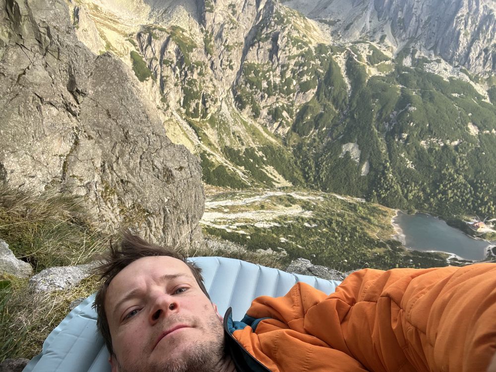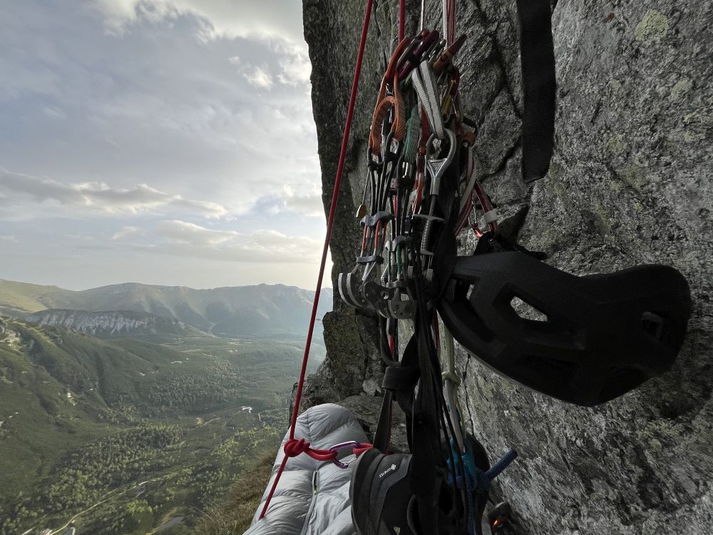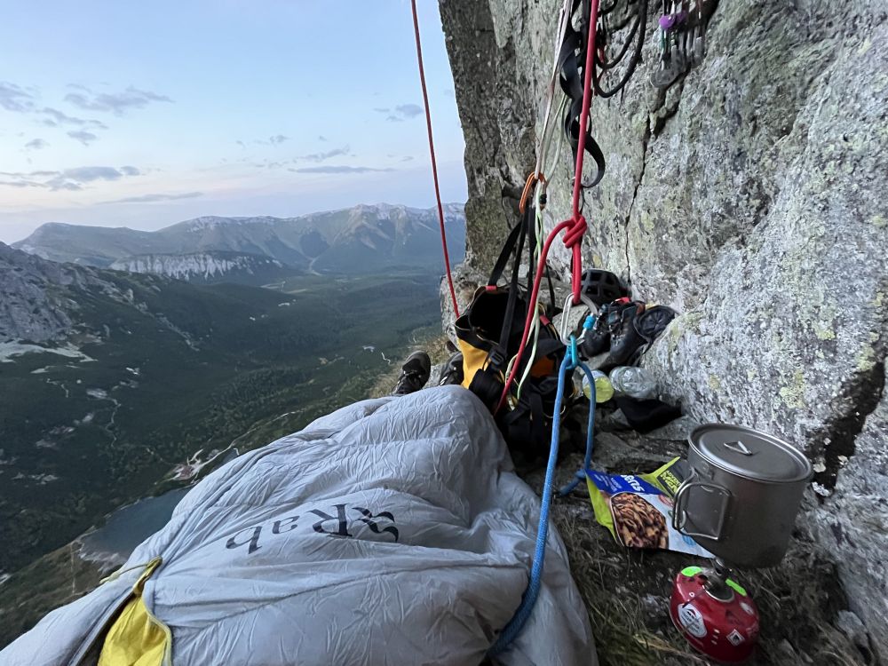 Takže pokračuji ve svém větrném tunelu. Pod sedmou délkou, kde je šikmá police, dorazím brzo, takže nechávám svini napást na kousku tatranské trávy a lezu dál. Vylezu a zafixuji si další dvě délky. Pak romantika na nafukovací skluzavce v noci, jelikož police je sice dobrá, ale ubíhá ve dvou směrech. Kromě jištěného spaní v sedáku si proto dělám i smyčku na nohy.