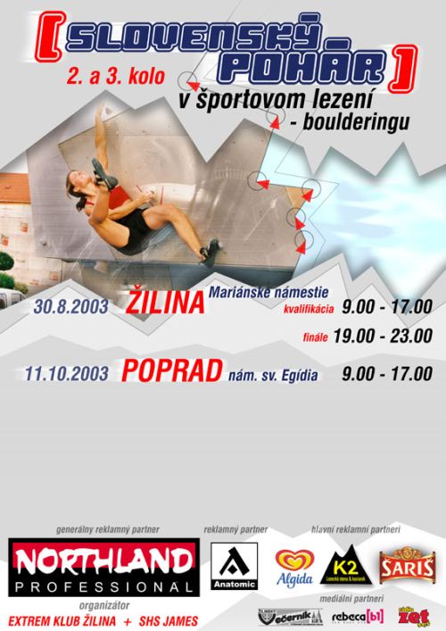 Ako sme už avizovali skôr, v sobotu 30.8.2003 sa v Žiline uskutoční už druhý ročník pretekov v boulderingu pod názvom NORTHLANDCup 2003, zároveň to bude 2.kolo Slovenského pohára v športovom lezení - boulderingu. Tu sú detaily pretekov: