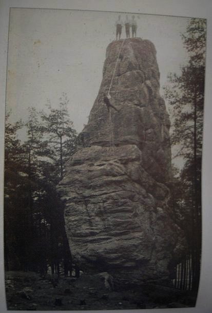 Gahlerova věž v roce 1911. Stromy okolo věže jsou pěkně vykácené. Občas v neděli možná přišli rodiny s dětmi na piknik, zatímco otcové zlézali vrcholy okolních věží.