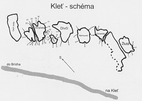 proto posílám část průvodce, který vytvořil Honza Mára. Doufám že se neurazí. Jedná se o oblast  Kleť, což je velice známý kopec v okolí Českého Krumlova, v CHKO Blanský les.  Přístup je možný ze železniční stanice Č.Krumlov, poté kolem kasáren do Vyšného a odtud po modré značce okolo Modrého obrazu na vrchol Kletě cca. 5km. Z vrcholu okolo televizního vysílače a po 50m po pravé straně jsou z cesty vidět skály (ehm skalky). Další možnost je: nechat se vyvézt lanovkou na vrchol, lanovka vede z opačné strany kopce z obce Holubov, u lanovky je možno parkovat. Na vrcholu je rozhledna, hvězdárna, hospoda a za dobré viditelnosti krásný výhled na Alpy. Skalky jsou 4-6m vysoké, a proto není nutné lano, i když jsou některé cesty osazeny jištěním, je to oblast spíše na 1 den (podle výkonnosti) je zde možno velmi dobře bulderovat. Je tu možnost dalších ještě stále neobjevených linií.