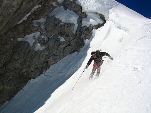 V dubnu nastal ten správný čas ke sjetí  45 stupňového Scchafriese JV žlabu  v pohoří Schnee Alpe  pod chatou Schneealpenhaus, 900 výškových metrů náročného čtverkového sjezdu.