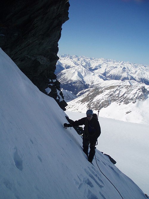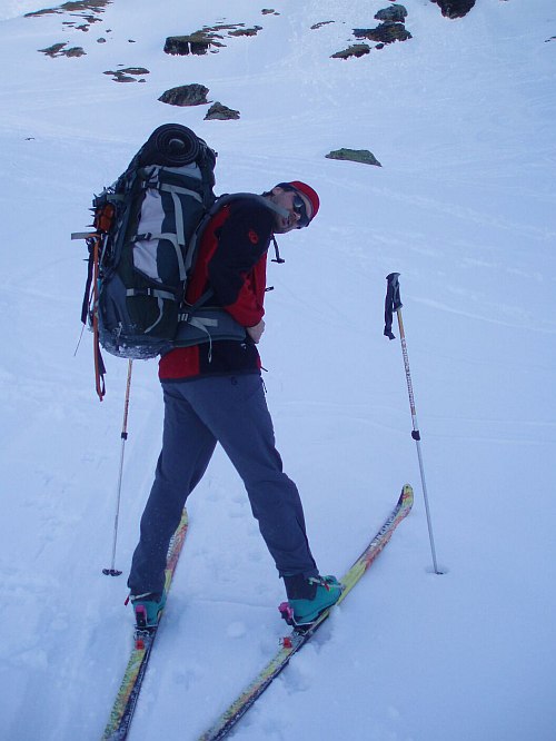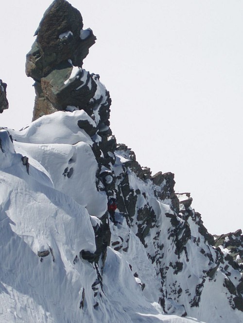 Nejvíc sil mi ale ubírá dvacetimetrový traverz strmým rozměklým sněhem a následující výlez na hřeben ve sněhu a sklonu stejné kvality. Aby to nebylo tak jednoduché, tak nás v tomto asi nejhorším místě hřebene (za našich podmínek) předbíhá Bimboška, při čemž ztrácíme asi hodinu času.