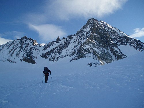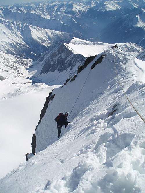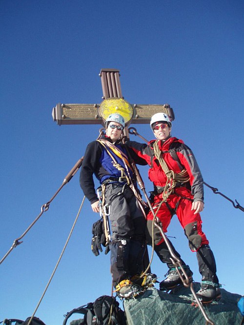 Následuje už v celku pohodový dolez na vrchol. Jen už nám moc nestačí dech, takže krátké pauzy na sebe nenechají dlouho čekat. Jedna aklimatizační túra na lyžích by asi nebyla na škodu, i když vrchol má jen necelých 3800. Na vrcholu si třeseme pravicemi ve čtyřech-v podstatě společně dolézáme i s Bimboškou a Jardou. Teď už ale definitivně dostáváme strach o Vendu s Alešem, které jsme od Frühstückplatzu nikdo nezahlédli. Nemáme jim jak pomoci, tak se navzájem fotíme a sestupujeme a slaňujeme do sedýlka mezi Grossglocknerem a Kleinglocknerem.