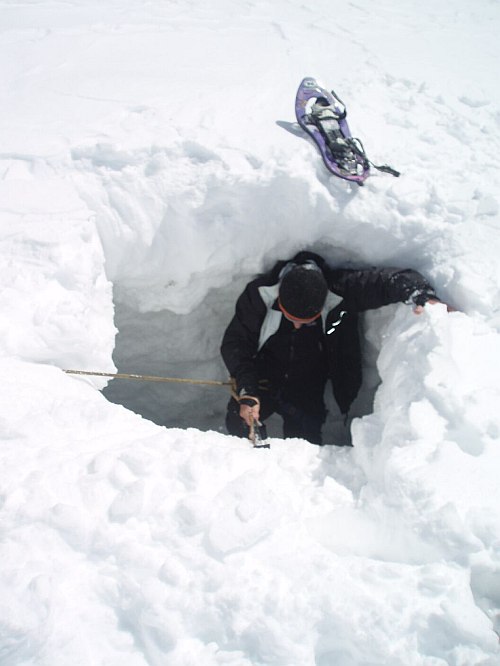 Sestup už je na pohodu, jistíme se přes tyče na hřebeni a za chvíli jsme na Johann hutte, kde nás očekává Bimboš, který tam nocuje s druhou půlkou naší party. Dává nám napít čaje, cpeme do sebe trochu sušenek a mastíme po ferrátce dolů na ledovec a po něm při zapadajícím slunci zpátky na Stüdlhütte. Tam lehce zapíjíme úspěch a brzo usínáme. Stále bez Aleše a Vendy. Ti dorážejí ve dvě ráno s čelovkama-otočili to ještě před Frühstückplatzem a slaňovali po hřebeni zpátky. Proč jim to trvalo tak dlouho, na to sem se jich ještě nestačil zeptat. Ráno mě bolí celý člověk, ale přibalujem do baťůžku sondu a lopatu, zapínáme pípáky a jdeme se ještě protáhnout na Romariswandkopf. Kousek nad chatou mi na zádech pípá esemeska. Píše Aleš, který pod nástupem do Stüdlgratu hledá rukavice, které jim předchozí den spadly z hřebene. Píše: „Ahoj, jedna zenska spadla do trhliny v Teufelskamp, nemate tam cestu? Nema lano, potrebuje vytahnout! Ales“ Odepisuju, že si uděláme cestu a šviháme jak můžeme směrem k Teufelskamp.