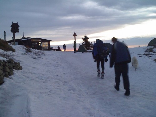 Je sobota půl osmé a vyrážíme z Papežova. Podmínky jsou skoro ideální, je jasno, teplota -5, v noci nasnežilo pár centimetrů snížku. Běžkař jde tradičně cestou, já uhýbám po několika metrech doprava do lesa. Jdu sám a tak nemám žádnou představu o tom, jestli zvolené tempo je pomalé nebo rychlé. Mně se zkrátka jde dobře. Přesně za hodinu jsem na Zimném a tempo se mi zdá pomalé. Zrychlovat ale nebudu, protože mám ještě mnoho metrů stoupání před sebou a upřímně řečeno, ani mi to nejde. Pod sjezdovkou koukám doleva na cestu a vidím "svého" běžkaře. A to jsem si myslel, že na mne již půl hodiny čeká v Šantánu. Na kole mu cesta na vrchol Lysé trvá 50 minut. No, ale zima je zima.