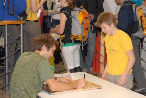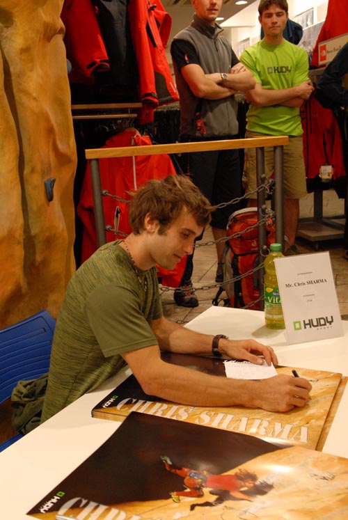 Chris Sharma podepisuje svoje plakáty v prodejně HUDYsportu  Na Perštýně.
