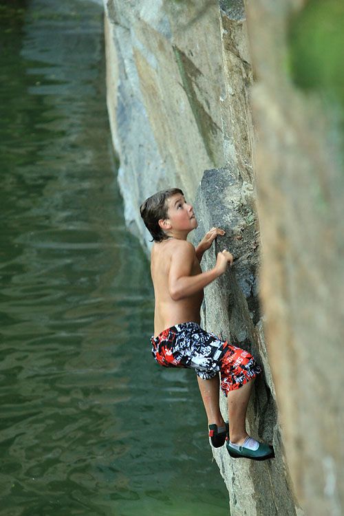 Soutěžili odvážně i mladší ročníky – zde Jiřík v asi 8m vysokém DWS boulderu za 7