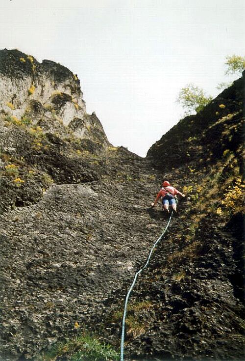 Nevidím ani důvod, proč by tu měl skrz přírodu nějaký zákaz lezení platit - nástup je suťovištěm, které vzniklo tím, že tu za bolševika lámali šutr (envitomental impact lezce na toto prostředí roven nule), výstup vede žlabem vymydleným vodou, náhodné květině se člověk vyhne (EI lezce též nula), sestup z vršku k nástupu vede suťoviskem skrz les (EI lezce též nula). Kdo vyřezal stromy v travnatém svahu v poslední délce, nevím, ale pochybuju, že to byl Karel B.
