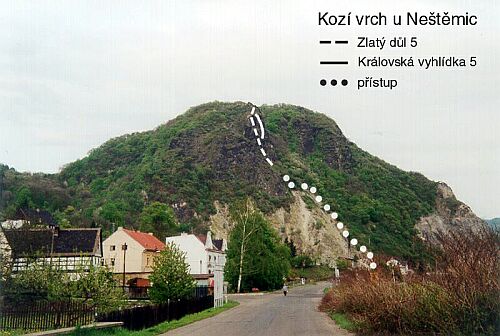 Další varianty přístupu: Autem z Neštědic po silničce na Mašovice (detailní info v článku o Studeném masivu zde na Lezci). Pojedete do prudkého kopce, Kozí vrch po levé ruce. V pravotočivé zatáčce, kde odbočuje zelená značka doleva, nechte auto a přes louku sejděte do sedla Koza Hillu. Tady je turistický rozcestník a vychází odtud cesta na vrchol. Z vršku sestupte centrálním žlabem po jižním svahu až k nástupu cesty. Je z vašeho pohledu po pravé ruce.
