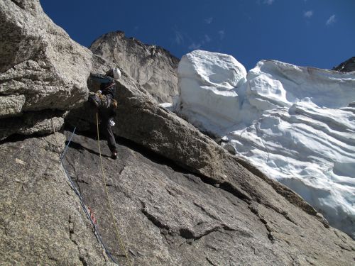 Táto stena si ma vyhliadla pred rokom a hneď si ma omotala okolo prstu. Nemal som šancu a už ďalší rok som sa proste musel vrátiť. V spodnej časti steny nevedie žiadna súvislá porucha a tak prekľučkovať kompaktnými platňami bol celkom slušný oriešok na začiatok tohto 8 dňového vertikálneho blues. Aby sme neriešili len lezecké problémy, tak si počasie povedalo, že nás trochu preverí a na tri a pol dňa nás uväznilo pod previsom. Našťastie sa na Brťákove narodeniny zľutovalo a doprialo nám jeden deň na vrcholový útok. Na tento vrchol vedú iba dve cesty a z toho jedna je naša, takže radosť neskutočná. Mali sme šťastie ako sviňa, lebo po tomto peknom dni prišli ďalšie tri dni totálneho pekla. Osmy deň sme si zase zbalili tie svoje fidlátka a v daždi zlanili na zem.