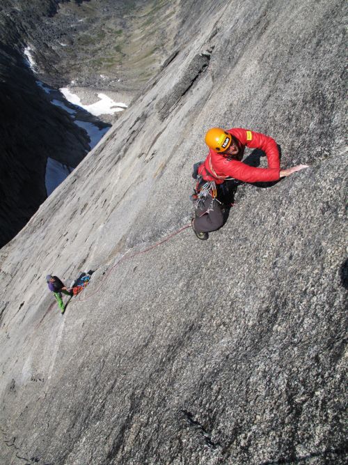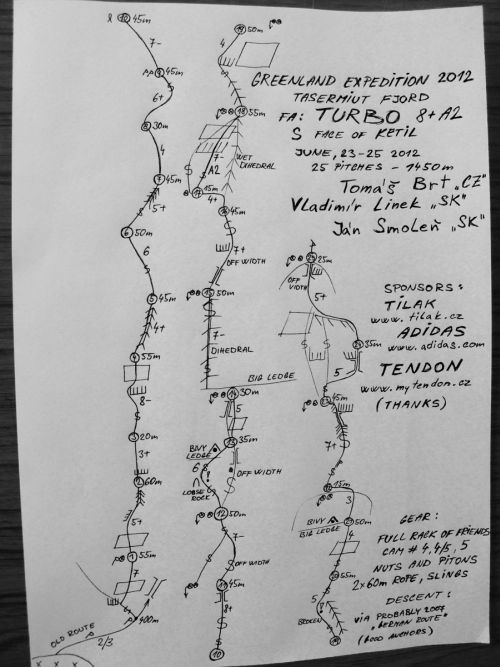 Pri spiatočnej ceste sme boli nakoniec radi za tutové štandy v Novej ceste, ktorou sa dá krásne zlaniť celá stena priamo dole. Na vrchol Ketilu sme doliezli 25. 6. 2012 po dva a pol dňoch lezenia. Na Ketile ešte žiaden Slovák ani Čech nebol, tak máme radosť jak sviňa!