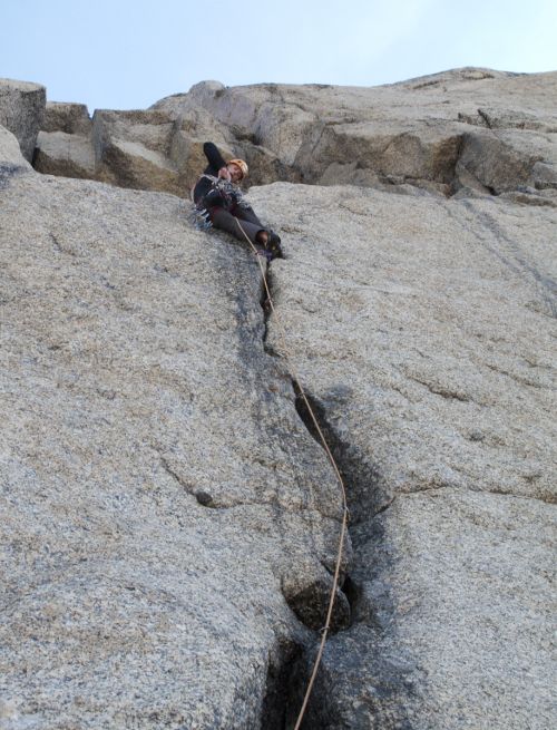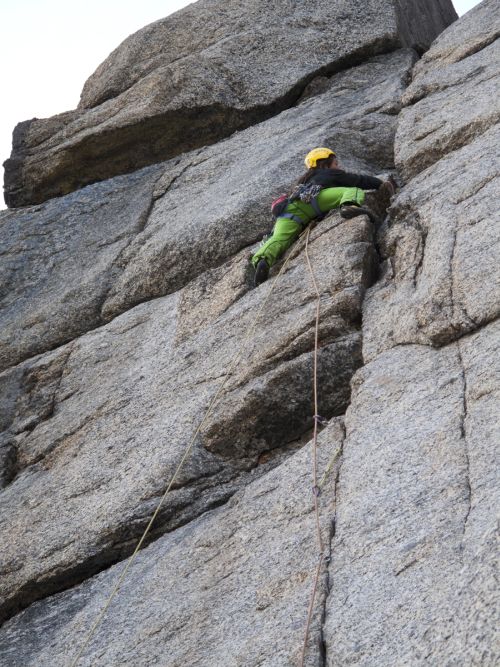Zohnať informácie o tejto žulovej hore je ako hľadať ihlu v kope sena! Stáli sme pod južnou stenou a jediné čo sme vedeli je to, že by tam mala niekde viesť nejaká stará cesta. Línia sa našťastie dala jednoducho vytušiť a už po niekoľkých sto metroch spoločného nástupu sme našli starú skobu, ktorá potvrdila naše predtuchy. Spodnú časť steny pretína zľava doprava výrazná porucha, ktorou sme sa dostali do veľkého ypsilonu. Tu sme opustili Starú cestu, ktorá pokračuje ďalej doprava a vydali sa priamo stredom ypsilonu svojou cestou k vrcholu. Po dvanástich dĺžkach nás čakalo prekvapenie v podobe tutového štandu z dvoch nitov previazaných slučkou. Čumeli sme ako péro z gauča, že čo sa deje?! Niektoré ďalšie dĺžky boli tak jasné, že nemalo význam kľučkovať popri logickej špáre holou platňou len aby sme liezli svoj smer a tak s touto, nazvime ju Novou cestou máme nakoniec asi päť spoločných dĺžok.