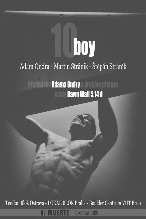 V rámci každého kola 10boye navíc proběhne přednáška Adama Ondry o druhém přelezu cesty Dawn Wall 5.14d v Yosemitech.