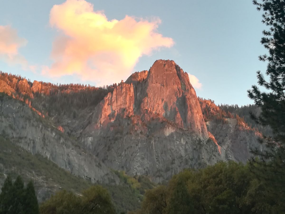 Sentinel, jako náhrobní kámen čnící nad Údolím při zapadajícím slunci
