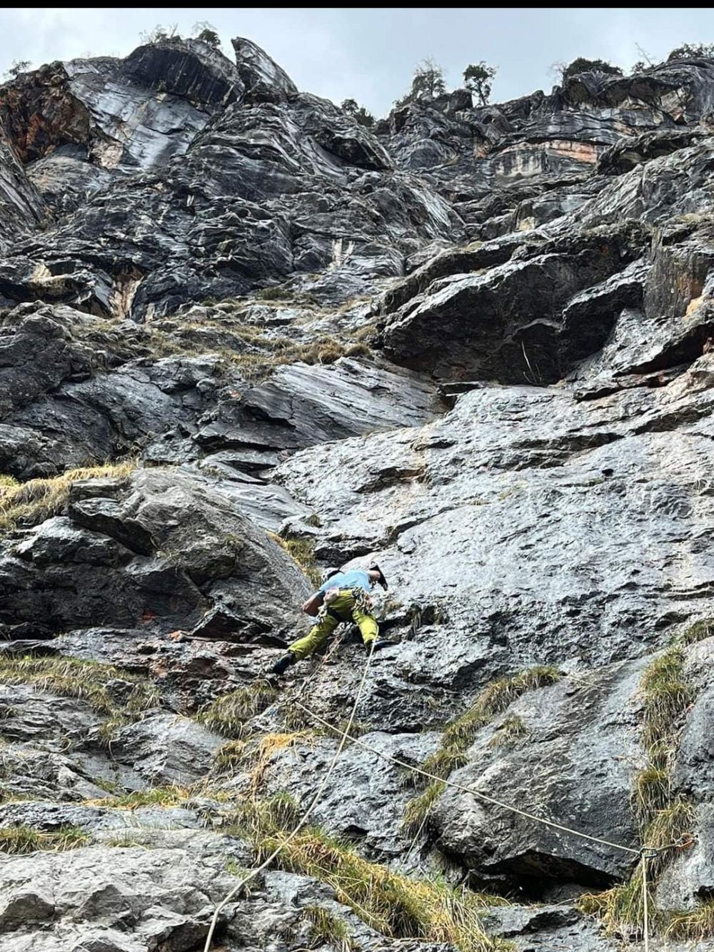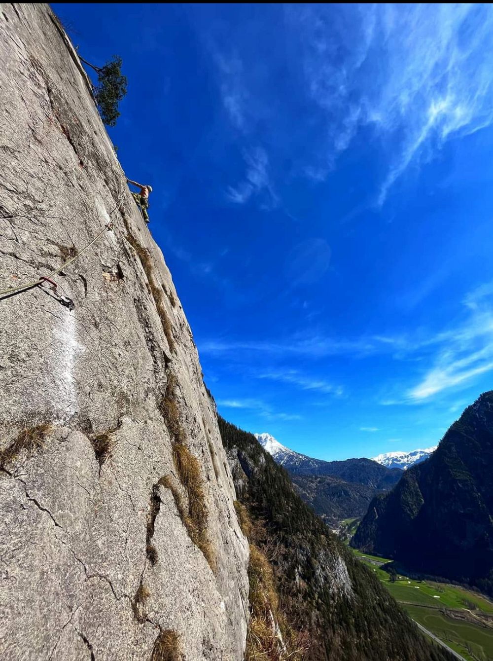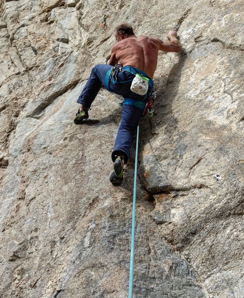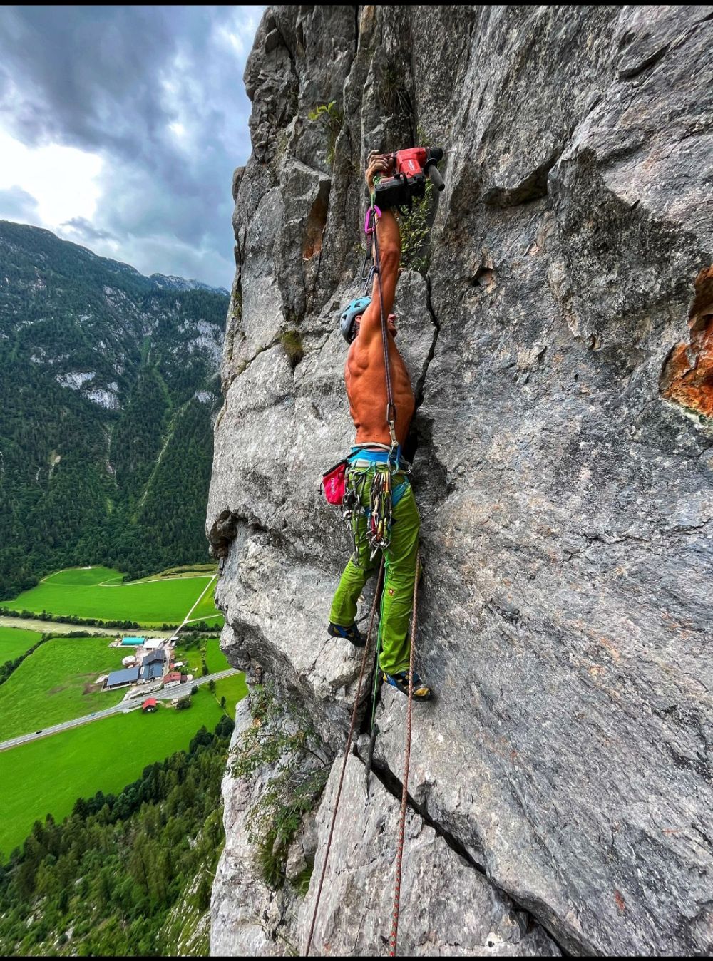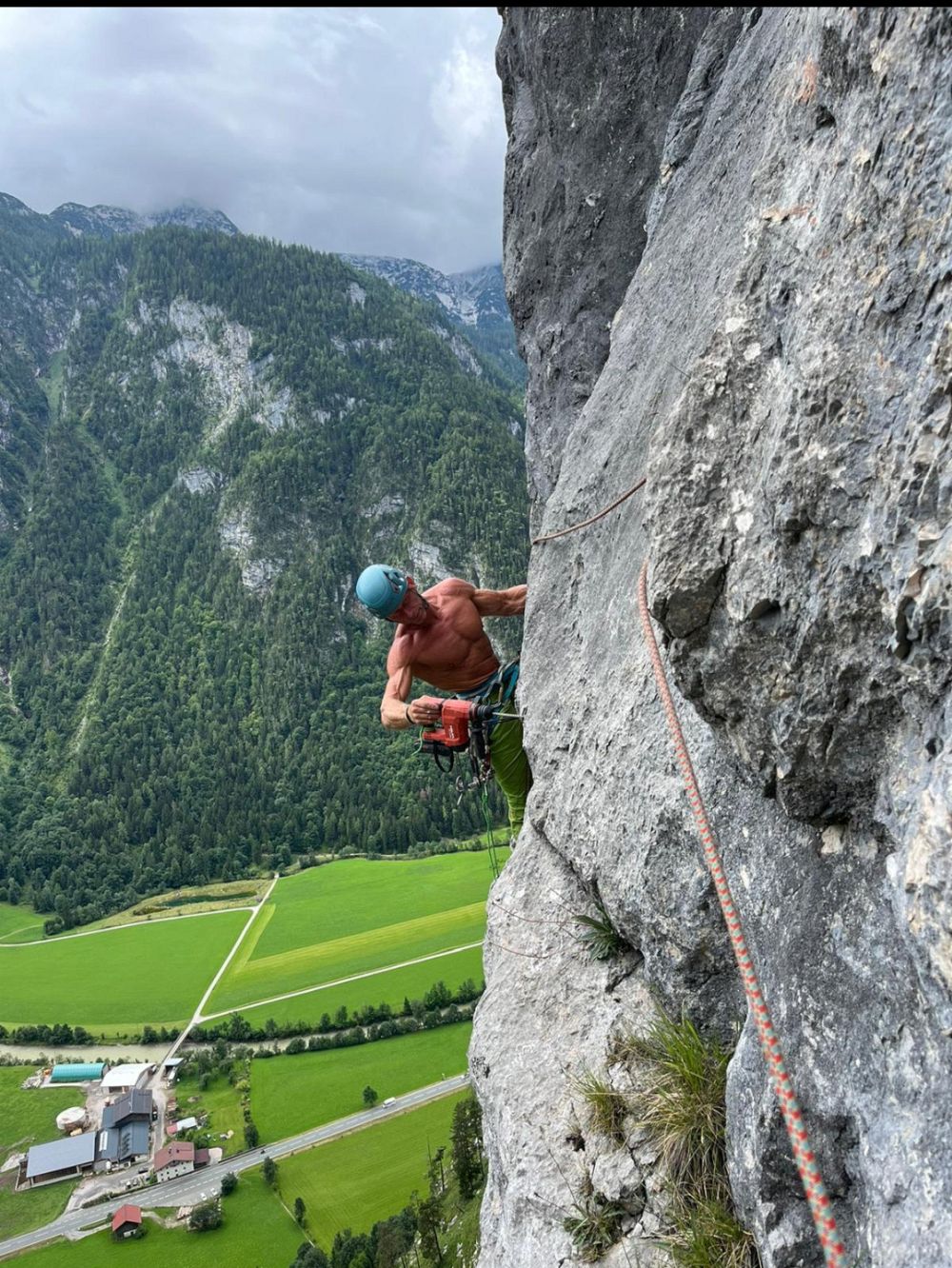 Vrátili jsme se teď při zpáteční cestě z Maltatalu, kde hlásili špatné počasí a za 6 hodin jsme to dovrtali a vyčistili až nahoru. Pak jsme našli vršek AULINU, dovrtali klíčovou délku, za mě úplná pohádka v převislé desce po sokolech a dírách cca 40 m a chybělo opravdu trošku. Obtížnost této délky okolo 7b. Slanění dolů, což vymyslet na těchto vysokých cestách není vždy lehké. Do auta a za 4,5 hodiny doma úplně na kaši. Cestu jsme nazvali PAIN IS MYTH a má 290 m a kromě jedné délky za 6b+ je vše lehčí. AULIN RP dáme příště.