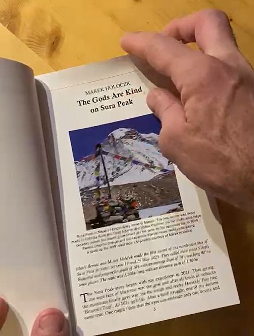 Foto Máry Holečka ze Sura Peaku se dostalo na titulku britské ročenky The Alpine Journal 2023 s nejvýznačnějšími horolezeckými výstupy uplynulé sezóny. V publikaci je jako první Márův článek o prvovýstupu severozápadní stěnou nepálské šestitisícovky Sura Peak (6764 m), který se mu spolu s Matějem Bernátem povedl vylézt loni v květnu.