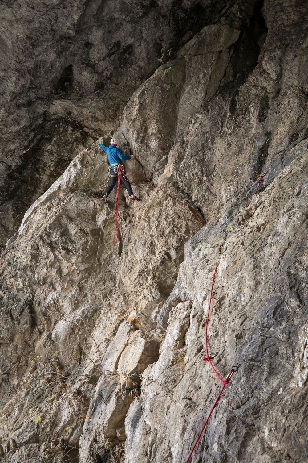 Ta spára byla znamení pro možný spodní kotevní bod – podobně jako u mého prvního vážného sóla (Zvon 8a, viz https://www.singingrock.cz/lumir-fajkos-zvon), kde byl pro změnu kousek od země borhák. Na vápně není vždy tolik možností jako na žule, kde se dá pravděpodobněji založit vlastní jištění nebo díky lehkým prvním délkám takový problém vůbec neřešit. Žulové Tatry jsou ostatně moje nejoblíbenější místo pro sólo a podařilo se mi tam vylézt cesty Titanic 7b+ OS, Katarzia 8a+ nebo Superdiretissima 7c.