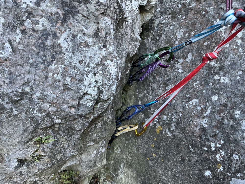 3. Nějaký tlumič jsem používal vždy (zkoušel jsem tři různé systémy tlumení). První jištění jsem necvakal s motýlem kvůli zachycení pádu (nemám ani procvaklé nakrátko, resp. jen tak aby to neomezilo pružnost lana v celé délce), protože by to stejně z tohoto místa bylo asi na zem. Byla to jen teoretická varianta backupu. To by se musela ta skalní spára při těch čtyřech friendech celá povolit… Cvaknul jsem tedy jen proto, že to tam bylo, ne proto, že by to něco mělo řešit.