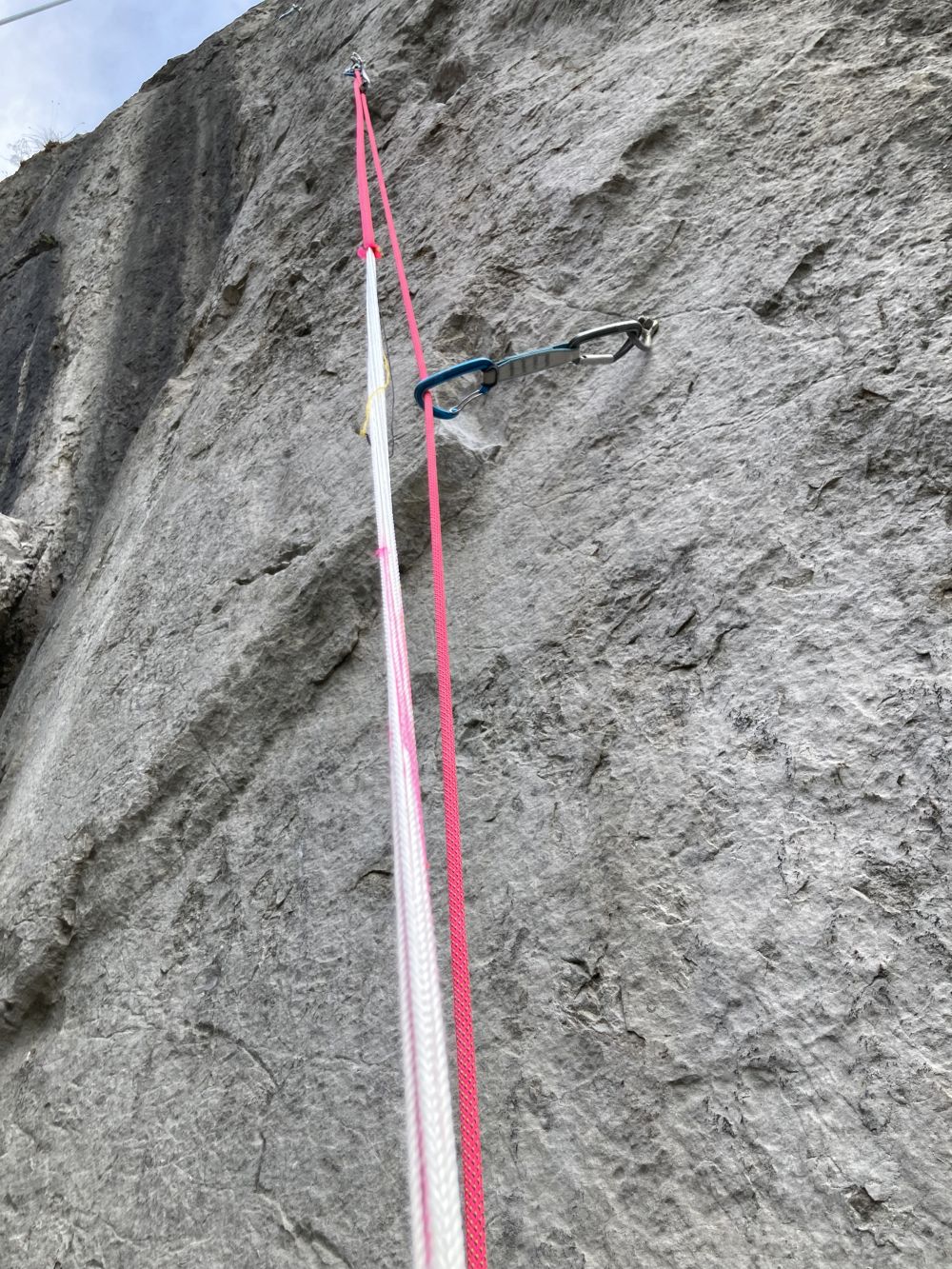 Jištění v cestě není ve vhodných místech ani pro standardní lezení ve dvojici. 5. jištění cvakali přelezci prodloužené a pak ještě nakrátko. 6. jištění by měl jistič odjistit. Na solo to vypadalo nejdřív akceptovatelné viz test z tohoto místa, ale malá změna trajektorie pádu to dost změnila… Nakonec jsem to vyřešil tak, že 5. a 6. jištění jsem cvaknul jen prodloužené (a ne už nakrátko). Takto jsem eliminoval potenciální stejný pád za cenu delšího odlezu od 6. jištění, ale v lepším terénu. Oplet viz komentář výše.