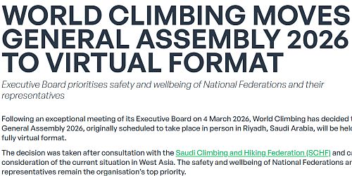 Mezinárodní federace sportovního lezení World Climbing (dříve IFSC) přesunula svou valnou hromadu pro rok 2026 do virtuálního formátu. Původně se měla uskutečnit fyzicky v Rijádu v Saúdské Arábii. Hlavním důvodem je aktuální situace v oblasti (kde válčí USA a Izrael s Íránem) a snaha upřednostnit bezpečnost zástupců národních federací, informovali včera představitelé World Climbing v tiskové zprávě, kterou nám zaslali.