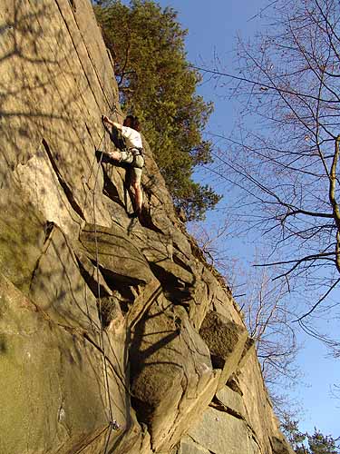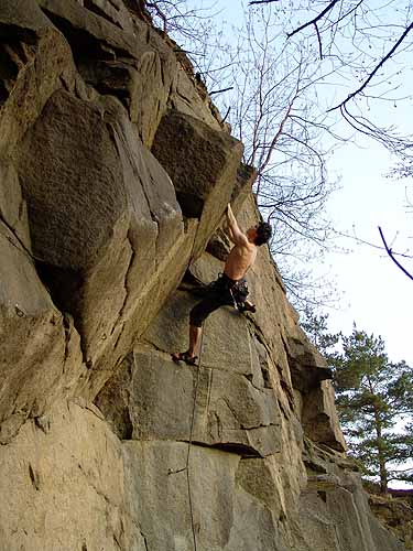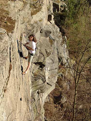 Již když lom shora obcházíte a hledáte sestupovou cestu, zvažujíce zda nebudete spíše potřebovat loďku, již v té chvíli se vám na pěkné čisté i když nevysoké stěnky sbíhají sliny. Pak ale objevíte terasovitou stezku kamzíkovitého charakteru a je vyhráno. Už stojíte pod prvníma cestama a vybalujete lano. Je to lezení převážně v kolmých stěnách po lištách. Najdete zde i dva pěkné převisy. Lezení je trochu silové, v každé z cest najdete aspoň jedno boulderové místo, které když překonáte, tak to již hrnete k nevysoko položeným slaňákům. Ty se třpytí většinou tak v 10 až 13m víc ten lomeček vysoký není. Ale stejně je to pěkné polezeníčko, zejména teď na jaře, v létě zde bude pěknej pařák, i když je tu pár stromů a tak i nějaký ten stín.