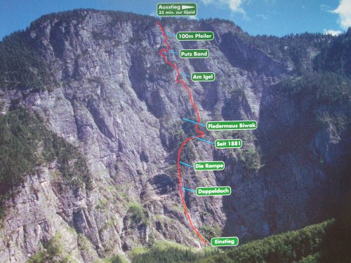 Od cedule k nástupu 50minut, nástup -- Seit 1881 2h, Seit 1881 -- Putz Band 2h, Putz Band -- vrchol 40 minut. Vrchol -- Gjaidalm cca 40 minut Celkem tedy necelých 6 hodin na vrchol, ale byla tam nějaká pauza kvůli dešti. Dolů zpět k jezeru asi dvě hodinky po sjezdovce