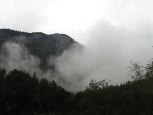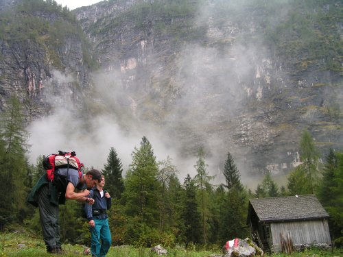 Hezky u jezera v Hallstattu zrovna nebylo. Jen Erben Karel Jaromír by možná kvitoval oblaka těsně nad hladinou se valící, se zeleným mužíkem na to pole podle skal tleskajícím. My naopak jsme byli trochu nejistí, zda máme vůbec někam jít, když zelená cedule dole u silnice říká něco ve smyslu, že nastupovat po deváté hodině ranní se nevyplácí, a bylo kolem půl dvanácté. Soudruzi moji v boji se stěnou však povzbuzeni jejich předchozí stáží v Julských alpách soudružně pravili, že jdeme na věc. A tak jsme šli, snažíce si zapamatovat co nejvíce ze zelené nástupní cedule, zejména jména jednotlivých úseků abychom věděli, jak jsme daleko.