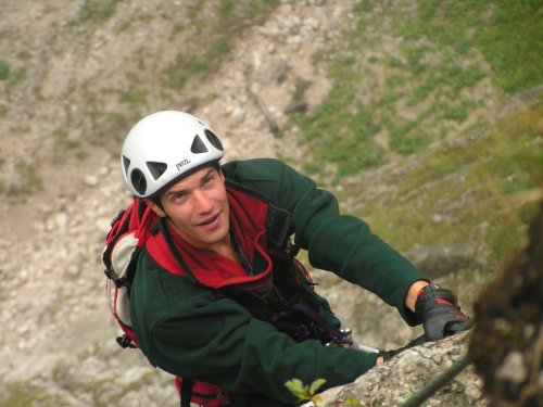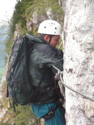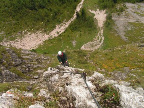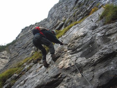 Hned jak jsem udělal první krok ve skále, vzpomněl jsem si na slova jakési poučné a naučné knihy , že na Eigeru v severní stěně to docela klouže, zvlášť když je vlhká. Přeci jen jsme asi mohli předpokládat, že vápenec v Severních vápencových Alpách na tom nebude o moc líp. Cirka po deseti minutách lezení mám tak trochu smíšené pocity, jestli nedělám nějakou blbost, po hodince cirkusového šplhání po laně jsem o tom už takřka přesvědčen a po třech hodinách promáčen na kost už o tom vůbec Jen trpce vzpomínám, jak na přelomu tisíciletí, když jsem s lezením po těhle železech začínal, i sebemenší obláček na obzoru znamenal ústup ze scény. No, člověk se, zdá se, svým přístupem k horám poněkud vyvíjí, a tak s klukama šplháme kolem pěti hodin po durch mokré skále, ze které se zhruba poslední dvě hodiny valí voda jak na Niagáře, což je zapříčiněno lehoučkým deštíčkem, který nás někde za půlkou překvapil. Lépe řečeno tedy nepřekvapil, protože v situaci, kdy se vlny zdola valí a v širá kola se roztahují, nemůže přijít nic než voda z nebe.